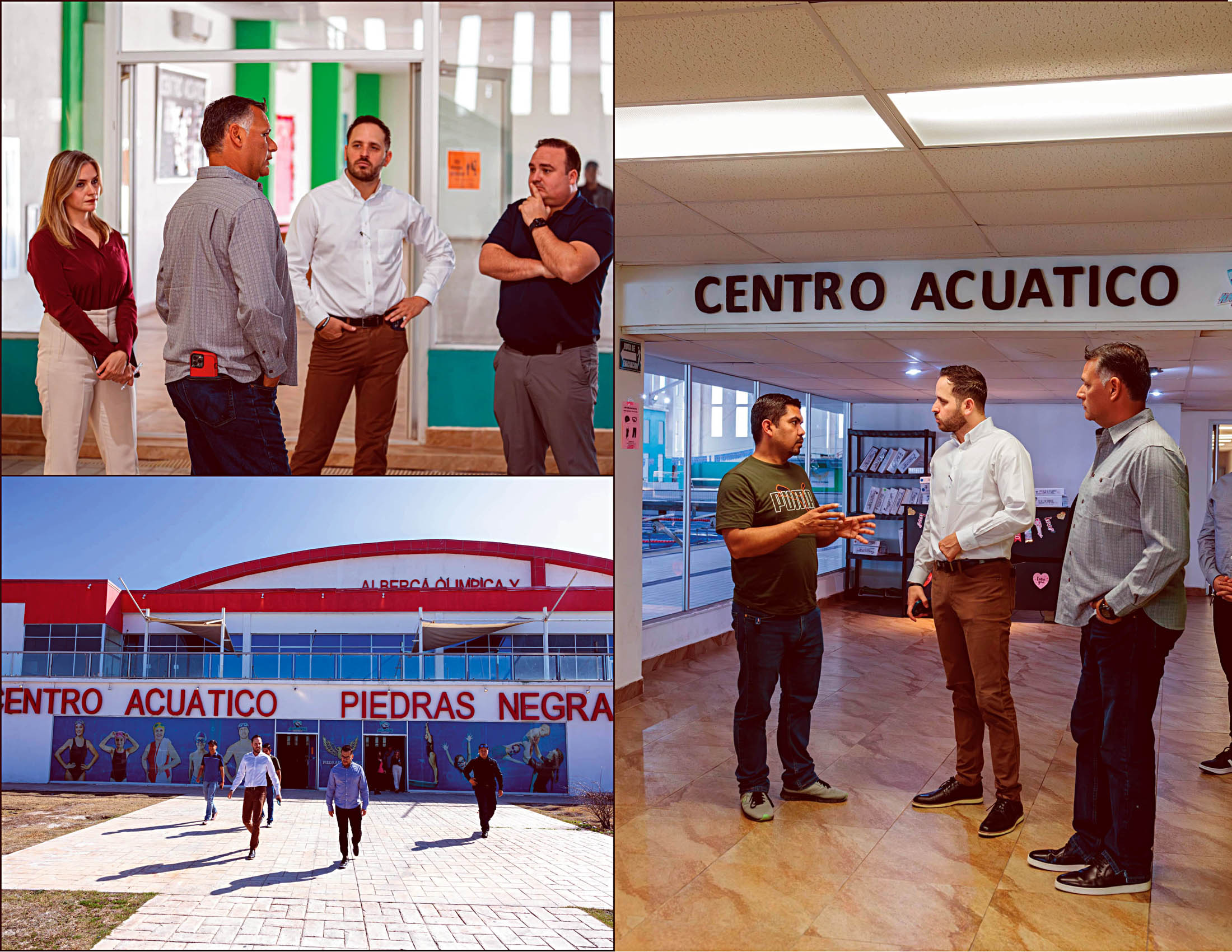El alcalde Jacobo Rodríguez realizó un recorrido por el Centro Acuático, acompañado de la directora de Desarrollo Social, Cynthia Villarreal, y el director de Fomento Deportivo, Abraham Lira, junto con representantes de la empresa encargada de la reparación de las bombas dañadas.