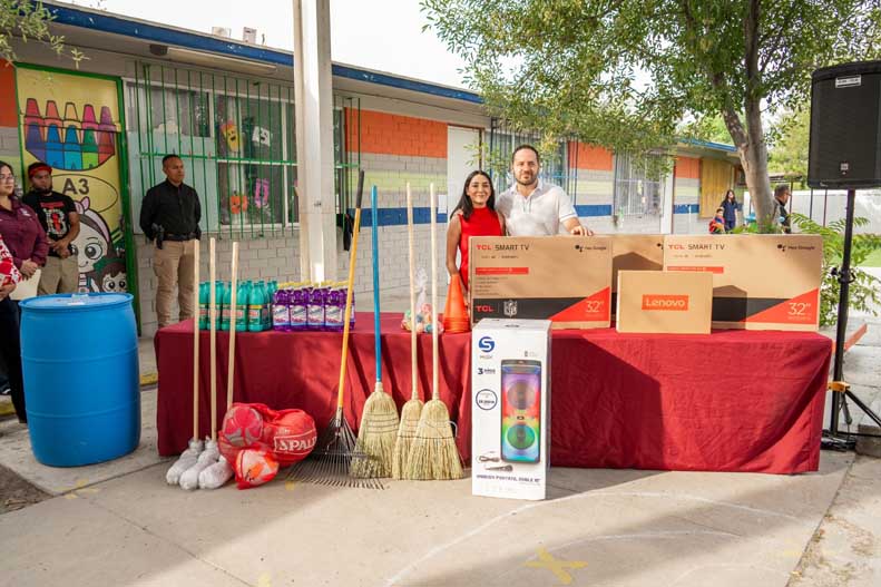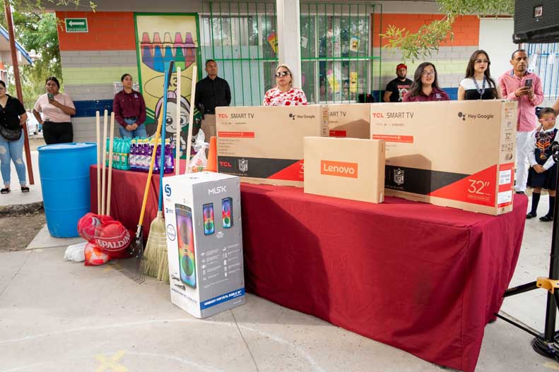 En el marco de la visita, Jacobo Rodríguez realizó la entrega de materiales para el plantel, tres pantallas, una laptop, una bocina y cuatro puertas ya instaladas, así como material deportivo y de limpieza, con una inversión total de 70,857 pesos, con ello reitera que su compromiso con la educación es permanente y seguirá fortaleciendo las escuelas de Piedras Negras.
