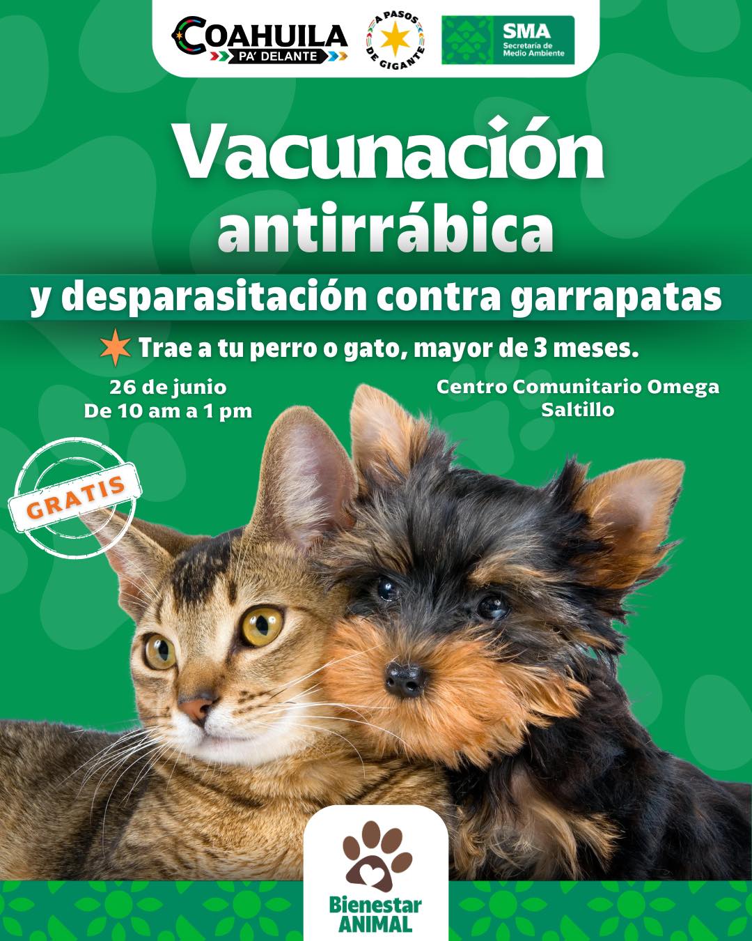 La Secretaría del Medio Ambiente de Coahuila invita a todos los dueños de mascotas en Saltillo a la jornada gratuita de vacunación antirrábica y desparasitación que se llevará a cabo este jueves 26 de junio en la colonia Omega.