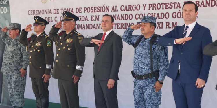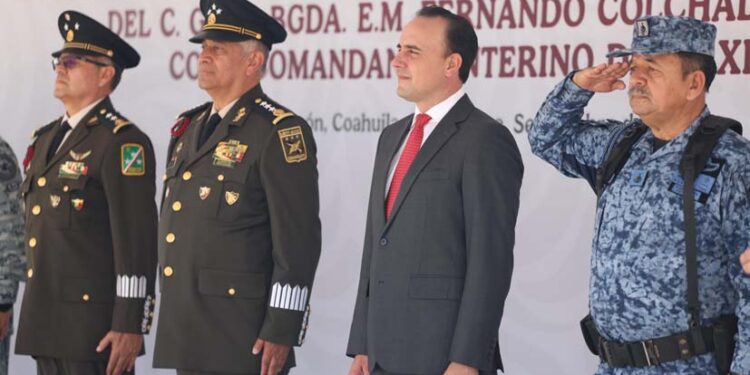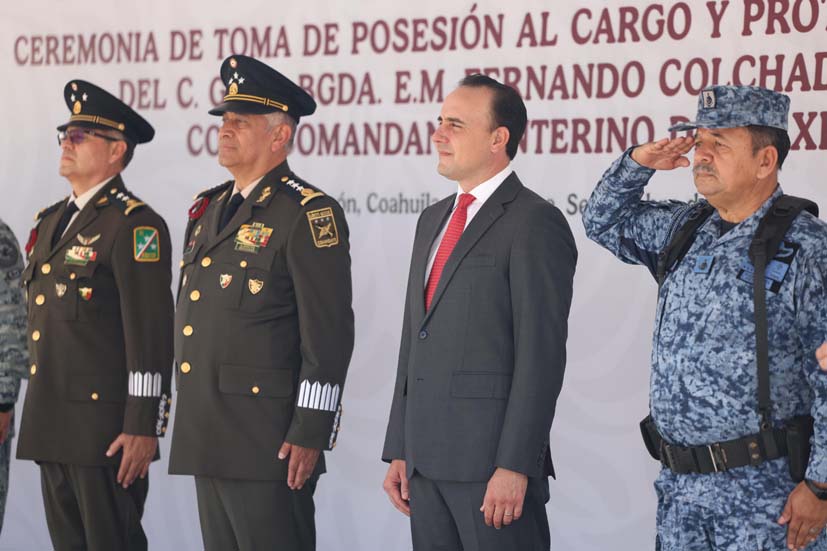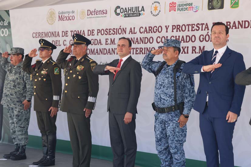 . “Hoy acompañamos en su toma de protesta y le dimos la bienvenida a nuestro Estado, al C. General de Brigada E.M. Fernando Colchado Gómez, nuevo comandante de la XI Región Militar. Aquí en Coahuila trabajamos con voluntad y coordinación con el Ejército Mexicano y las Fuerzas Armadas, siempre sumando esfuerzos para mantener la seguridad, la paz y el desarrollo de nuestro estado”, manifestó el Gobernador de Coahuila.