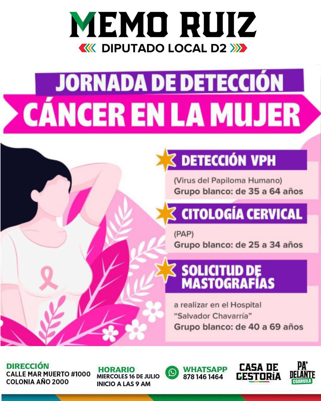 Piedras Negras, Coah. – [ABC COAHUILA] – 16 de julio de 2025.- En un esfuerzo por salvaguardar la salud de las mujeres coahuilenses, el Diputado Local del Distrito Número 2, Guillermo Ruiz Guerra, ha extendido una cordial invitación a la ciudadanía para participar en la Jornada de Detección de Cáncer en la Mujer. El evento se llevará a cabo hoy, miércoles 16 de julio, a partir de las 9:00 a.m. en la Casa de Gestoría del diputado, situada en Calle Mar Muerto #1000 de la Colonia Año 2000.