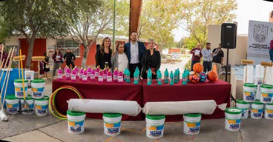 Durante el evento, el alcalde realizó la entrega de materiales de limpieza, equipo deportivo y material para trabajos de impermeabilización, con una inversión total de $55,422.00 pesos, en beneficio de cuatro salones y una bodega del plantel.