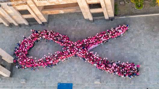 Al arribo a la explanada de la Presidencia Municipal, los participantes formaron el tradicional lazo humano rosa, símbolo internacional de la lucha contra el cáncer de mama, que representa la esperanza, la unión y el compromiso con la vida, gesto con el que se reafirmó la importancia de la solidaridad y la detección temprana. Posteriormente, se realizó la fotografía conmemorativa.