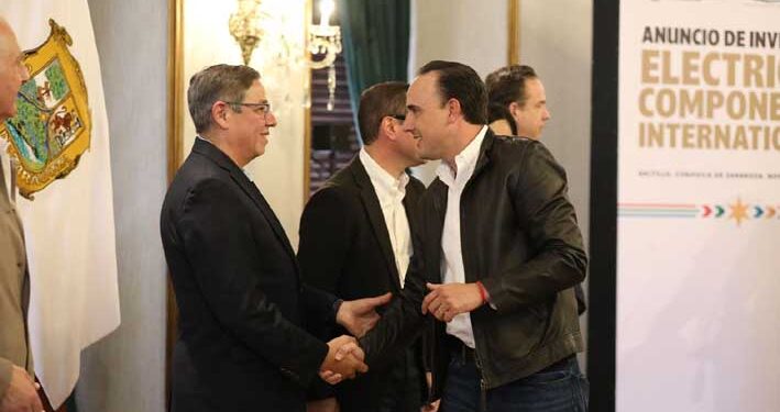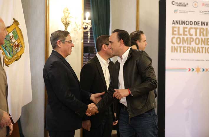 Desde Palacio de Gobierno en Saltillo, el gobernador Manolo Jiménez Salinas, acompañado por Román Alberto Cepeda González, alcalde de Torreón; el secretario de Economía, Luis Olivares Martínez; la directora de Pro Coahuila, Sofía Delgadillo; y la Presidenta del Congreso, Luz Elena Morales, anunció la llegada de la empresa Electrical Components International, en donde reiteró que en Coahuila se trabaja con voluntad y en equipo por la seguridad y el desarrollo económico.